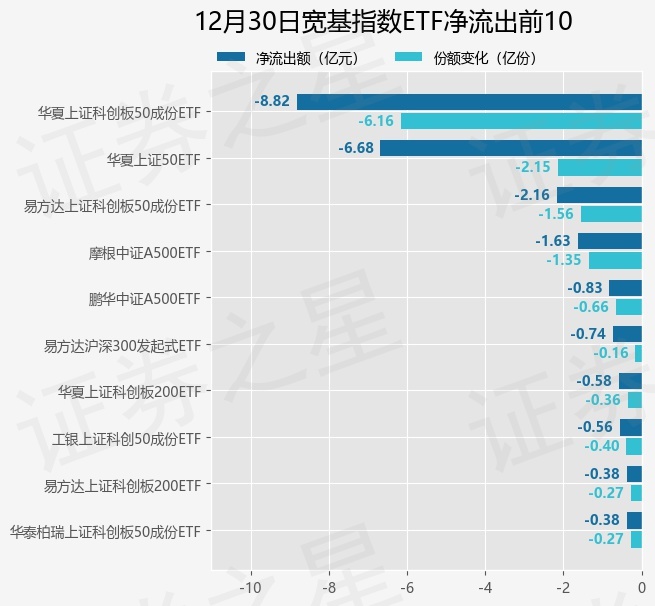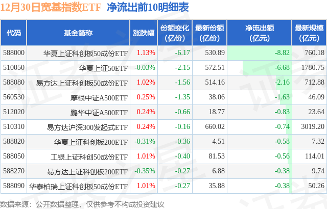 当日有73只宽基指数ETF基金出现资金净流出,其中净流出排首位的是华夏上证科创板50成份ETF(588000),份额减少了6.17亿份,净流出额为8.82亿元。