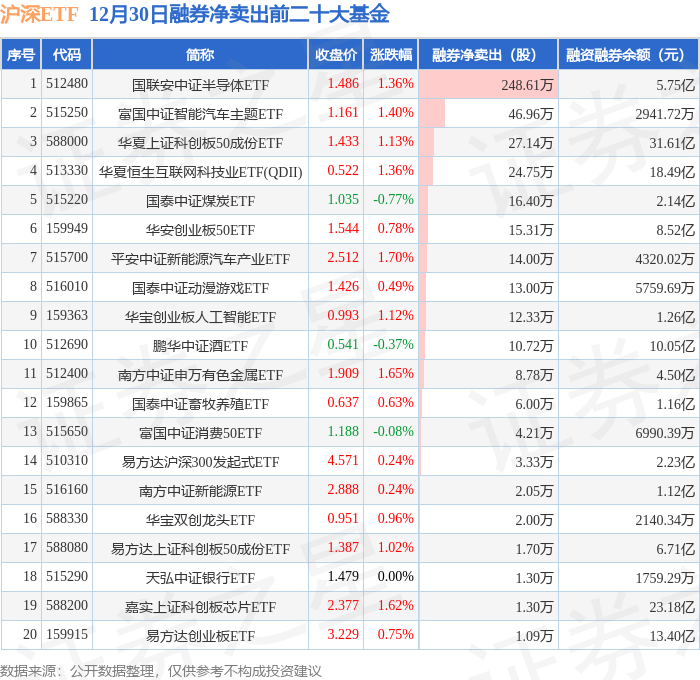 沪深ETF融券净卖出前三分别为:国联安中证半导体ETF(512480)融券净卖出248.61万股、富国中证智能汽车主题ETF(515250)融券净卖出46.96万股、华夏上证科创板50成份ETF(588000)融券净卖出27.14万股,前20具体见下表: