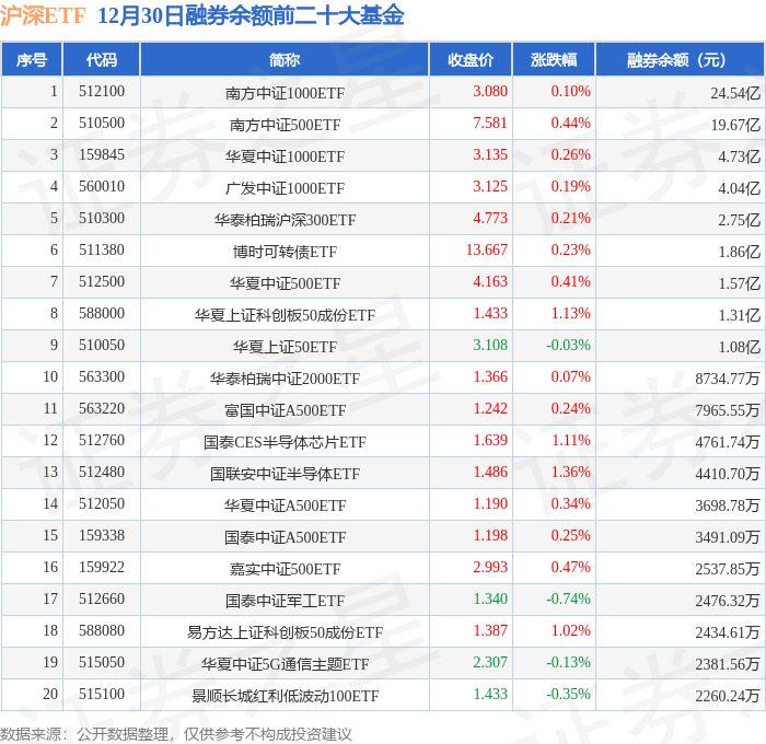 沪深ETF融券余额前三分别为:南方中证1000ETF(512100)融券余额24.54亿元、南方中证500ETF(510500)融券余额19.67亿元、华夏中证1000ETF(159845)融券余额4.73亿元,前20具体见下表: