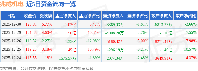 证券之星消息,截至2025年12月30日收盘,兆威机电(003021)报收于128.91元,上涨5.77%,换手率7.23%,成交量15.0万手,成交额18.63亿元。