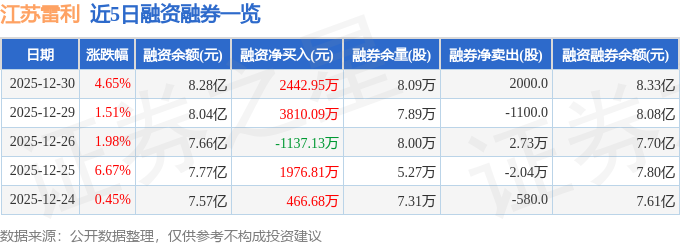 江苏雷利融资融券信息显示,融资方面,当日融资买入2.22亿元,融资偿还1.98亿元,融资净买入2442.95万元。融券方面,融券卖出2100.0股,融券偿还100.0股,融券余量8.09万股,融券余额456.57万元。融资融券余额8.33亿元。