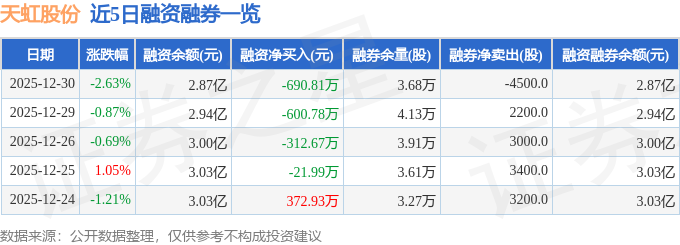 证券之星消息,截至2025年12月30日收盘,天虹股份(002419)报收于5.55元,下跌2.63%,换手率3.03%,成交量35.45万手,成交额1.97亿元。