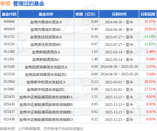 证券之星消息,2025年12月31日,金鹰改革红利混合(001951)发布公告,增聘李恒为基金经理,任职日期自2025年12月31日起,变更后金鹰改革红利混合(001951)的基金经理为李恒,韩广哲。截止2025年12月30日,金鹰改革红利混合净值为1.6390,较上一日上涨1.3%,近一年上涨5.54%。