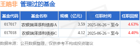王皓非先生:中国,博士研究生。历任农银汇理基金管理有限公司研究部研究员、高级研究员、投资部基金经理助理,现任农银汇理基金管理有限公司基金经理。2025年6月26日担任农银汇理瑞泽添利债券型证券投资基金基金经理。