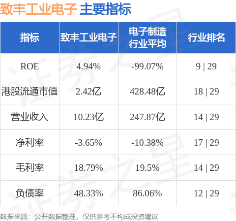 致丰工业电子港股市值2.42亿港元,在电子制造行业中排名第18。主要指标见下表:
