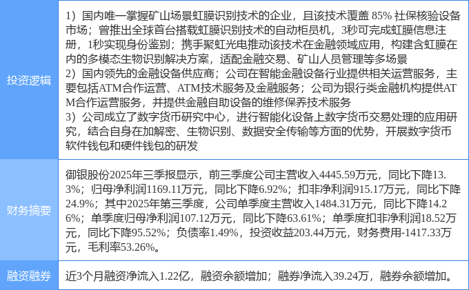 该股为虹膜识别,金融科技,数字人民币概念热股,当日虹膜识别概念上涨1.56%,金融科技概念上涨1.5%,数字人民币概念上涨1.25%。