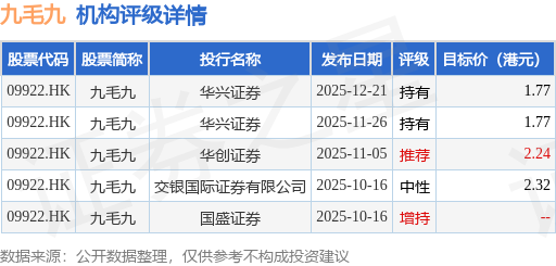 投行对该股的评级以持有为主,近90天内共有2家投行给出持有评级,近90天的目标均价为2.02港元。华兴证券最新一份研报给予九毛九持有评级,目标价1.77港元。