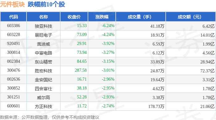 从资金流向上来看,当日元件板块主力资金净流出23.46亿元,游资资金净流入6.6亿元,散户资金净流入16.87亿元。元件板块个股资金流向见下表: