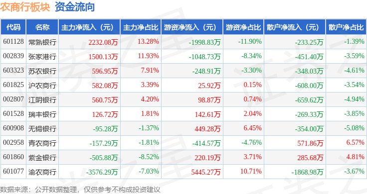 从资金流向上来看,当日农商行板块主力资金净流入1263.96万元,游资资金净流入2671.1万元,散户资金净流出3935.07万元。农商行板块个股资金流向见下表: