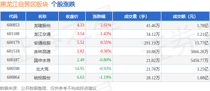 从资金流向上来看,当日黑龙江自贸区板块主力资金净流出5656.68万元,游资资金净流出2298.7万元,散户资金净流入7955.38万元。黑龙江自贸区板块个股资金流向见下表: