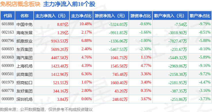 从资金流向上来看,当日免税店概念板块主力资金净流入7.84亿元,游资资金净流出1.14亿元,散户资金净流出6.7亿元。免税店概念板块个股资金流向见下表: