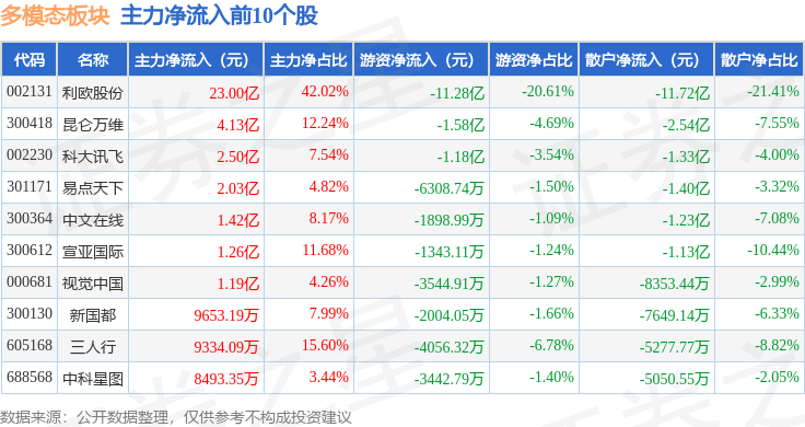 从资金流向上来看,当日多模态板块主力资金净流入42.65亿元,游资资金净流出18.53亿元,散户资金净流出24.12亿元。多模态板块个股资金流向见下表: