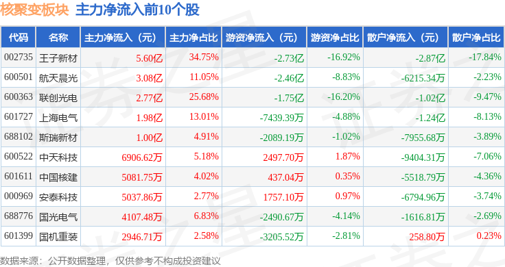 从资金流向上来看,当日核聚变板块主力资金净流出4.05亿元,游资资金净流出6.72亿元,散户资金净流入10.77亿元。核聚变板块个股资金流向见下表: