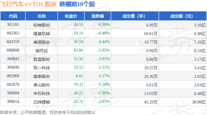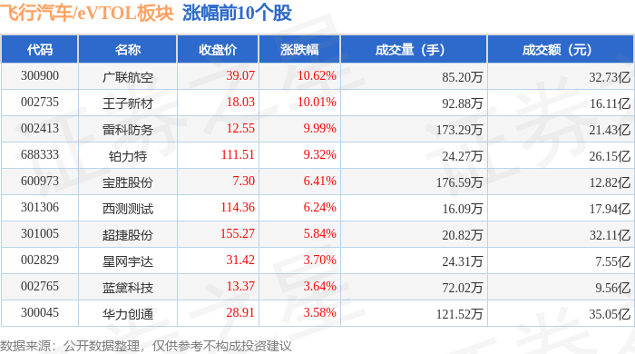 从资金流向上来看,当日飞行汽车/eVTOL板块主力资金净流出1.97亿元,游资资金净流出4.11亿元,散户资金净流入6.08亿元。飞行汽车/eVTOL板块个股资金流向见下表: