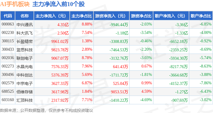 从资金流向上来看,当日AI手机板块主力资金净流出5.8亿元,游资资金净流入1.76亿元,散户资金净流入4.05亿元。AI手机板块个股资金流向见下表: