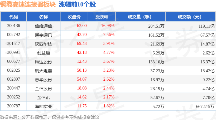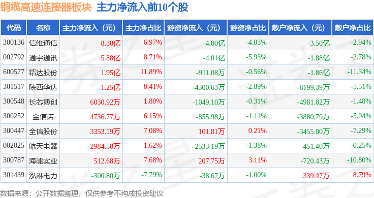 从资金流向上来看,当日铜缆高速连接器板块主力资金净流出5.14亿元,游资资金净流出6.26亿元,散户资金净流入11.4亿元。铜缆高速连接器板块个股资金流向见下表: