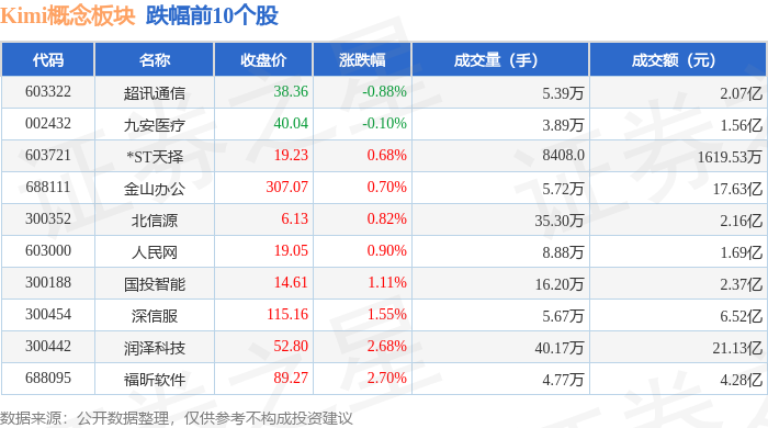 从资金流向上来看,当日Kimi概念板块主力资金净流入13.12亿元,游资资金净流出6.02亿元,散户资金净流出7.1亿元。Kimi概念板块个股资金流向见下表: