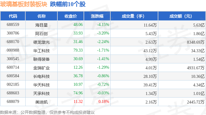 证券之星消息,12月31日玻璃基板封装板块较上一交易日下跌0.5%,海目星领跌。当日上证指数报收于3968.84,上涨0.09%。深证成指报收于13525.02,下跌0.58%。玻璃基板封装板块个股涨跌见下表: