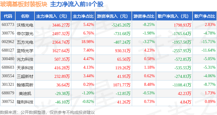 从资金流向上来看,当日玻璃基板封装板块主力资金净流出5.2亿元,游资资金净流入1.48亿元,散户资金净流入3.72亿元。玻璃基板封装板块个股资金流向见下表: