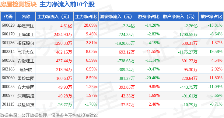 从资金流向上来看,当日房屋检测板块主力资金净流入4.35亿元,游资资金净流出2.46亿元,散户资金净流出1.89亿元。房屋检测板块个股资金流向见下表: