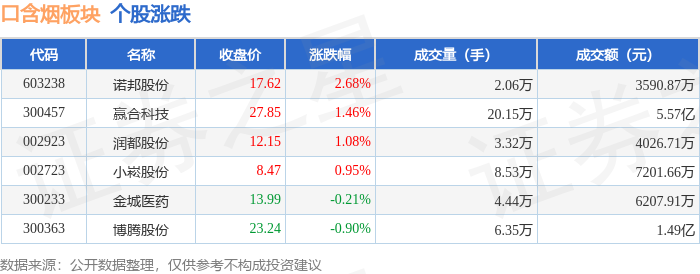 证券之星消息,12月31日口含烟板块较上一交易日上涨0.65%,诺邦股份领涨。当日上证指数报收于3968.84,上涨0.09%。深证成指报收于13525.02,下跌0.58%。口含烟板块个股涨跌见下表: