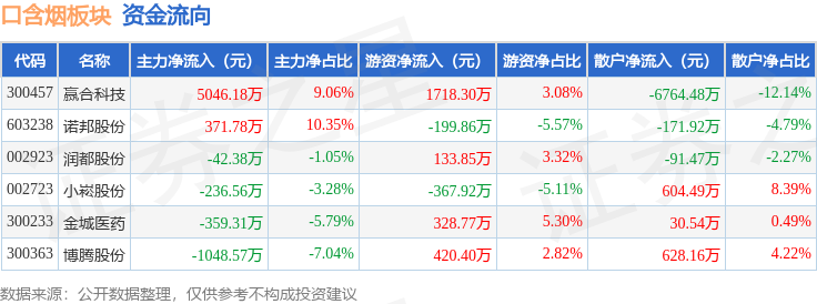从资金流向上来看,当日口含烟板块主力资金净流入3731.14万元,游资资金净流入2033.55万元,散户资金净流出5764.68万元。口含烟板块个股资金流向见下表:
