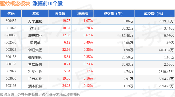 证券之星消息,12月31日驱蚊概念板块较上一交易日上涨0.12%,万孚生物领涨。当日上证指数报收于3968.84,上涨0.09%。深证成指报收于13525.02,下跌0.58%。驱蚊概念板块个股涨跌见下表: