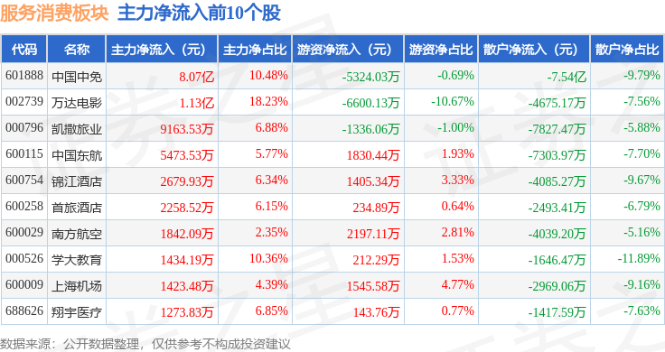 从资金流向上来看,当日服务消费板块主力资金净流入9.85亿元,游资资金净流入1938.15万元,散户资金净流出10.04亿元。服务消费板块个股资金流向见下表: