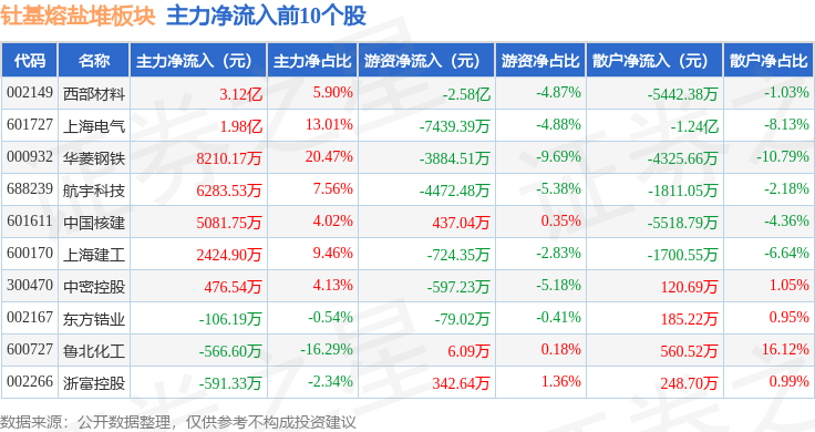 从资金流向上来看,当日钍基熔盐堆板块主力资金净流出1.29亿元,游资资金净流出2.66亿元,散户资金净流入3.95亿元。钍基熔盐堆板块个股资金流向见下表: