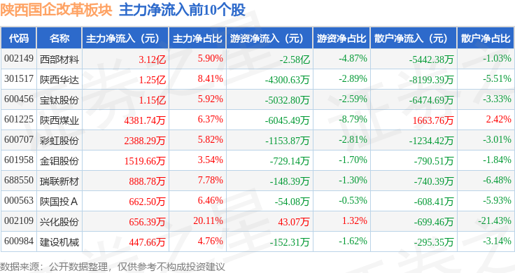 从资金流向上来看,当日陕西国企改革板块主力资金净流入4.1亿元,游资资金净流出3.71亿元,散户资金净流出3907.8万元。陕西国企改革板块个股资金流向见下表: