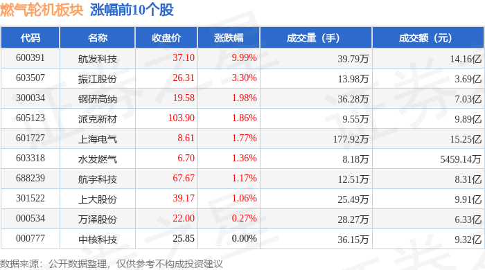 证券之星消息,12月31日燃气轮机板块较上一交易日上涨0.07%,航发科技领涨。当日上证指数报收于3968.84,上涨0.09%。深证成指报收于13525.02,下跌0.58%。燃气轮机板块个股涨跌见下表: