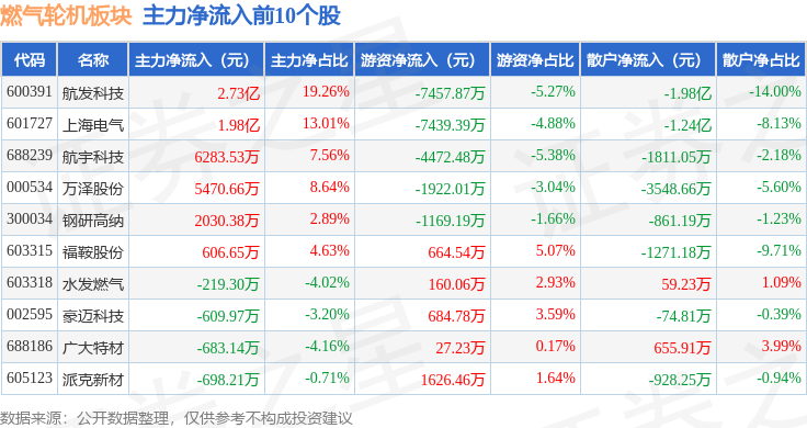 从资金流向上来看,当日燃气轮机板块主力资金净流入1.64亿元,游资资金净流出2.52亿元,散户资金净流入8881.93万元。燃气轮机板块个股资金流向见下表: