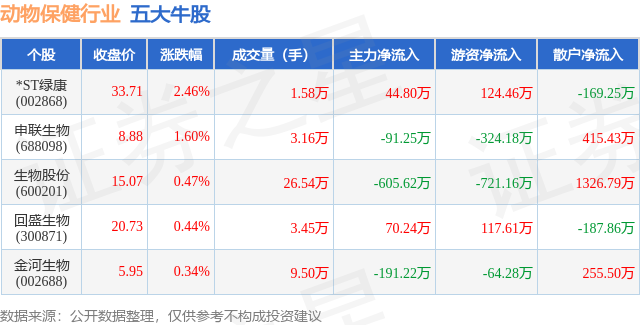 个股表现方面,动物保健行业当日领涨股为*ST绿康(002868),该股当日报收33.71,上涨2.46%,成交量1.58万,主力资金净流入44.8万元。申联生物(688098)以上涨1.6%紧随其后,该股当日成交量3.16万,主力资金净流出91.25万元。除此之外,生物股份(600201)、回盛生物(300871)、金河生物(002688)均进入当日牛股之列。具体个股列表见下表: