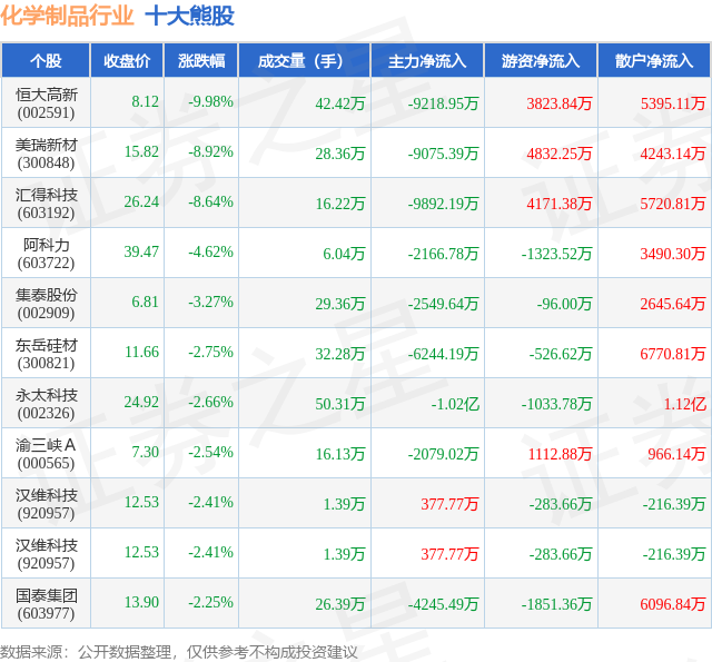 个股表现方面,化学制品行业当日领跌股为恒大高新(002591),该股当日报收8.12,下跌9.98%,成交量42.42万,主力资金净流出9218.95万元。美瑞新材(300848)以下跌8.92%紧随其后,该股当日成交量28.36万,主力资金净流出9075.39万元。除此之外,汇得科技(603192)、阿科力(603722)、集泰股份(002909)均进入当日熊股之列。具体个股列表见下表: