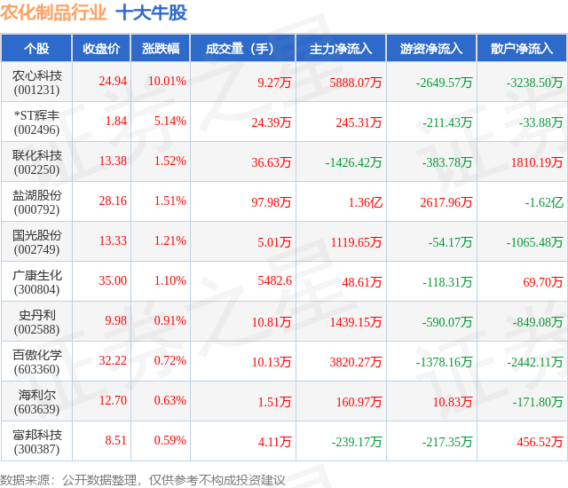 个股表现方面,农化制品行业当日领涨股为农心科技(001231),该股当日报收24.94,上涨10.01%,成交量9.27万,主力资金净流入5888.07万元。*ST辉丰(002496)以上涨5.14%紧随其后,该股当日成交量24.39万,主力资金净流入245.31万元。除此之外,联化科技(002250)、盐湖股份(000792)、国光股份(002749)均进入当日牛股之列。具体个股列表见下表: