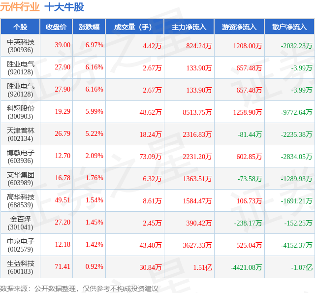 个股表现方面,元件行业当日领涨股为中英科技(300936),该股当日报收39.0,上涨6.97%,成交量4.42万,主力资金净流入824.24万元。胜业电气(920128)以上涨6.16%紧随其后,该股当日成交量2.67万,主力资金净流入133.9万元。除此之外,胜业电气(920128)、科翔股份(300903)、天津普林(002134)均进入当日牛股之列。具体个股列表见下表: