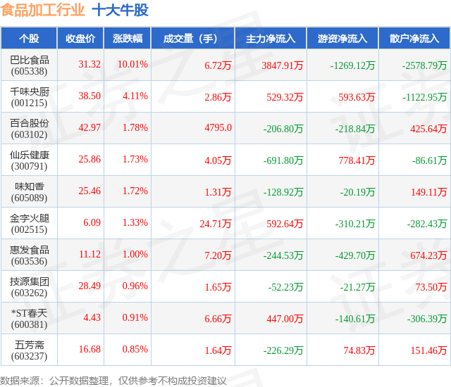 个股表现方面,食品加工行业当日领涨股为巴比食品(605338),该股当日报收31.32,上涨10.01%,成交量6.72万,主力资金净流入3847.91万元。千味央厨(001215)以上涨4.11%紧随其后,该股当日成交量2.86万,主力资金净流入529.32万元。除此之外,百合股份(603102)、仙乐健康(300791)、味知香(605089)均进入当日牛股之列。具体个股列表见下表: