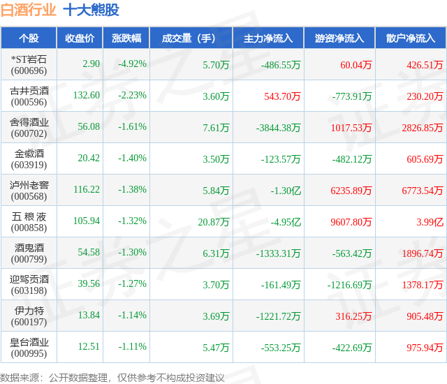个股表现方面,白酒行业当日领跌股为*ST岩石(600696),该股当日报收2.9,下跌4.92%,成交量5.7万,主力资金净流出486.55万元。古井贡酒(000596)以下跌2.23%紧随其后,该股当日成交量3.6万,主力资金净流入543.7万元。除此之外,舍得酒业(600702)、金徽酒(603919)、泸州老窖(000568)均进入当日熊股之列。具体个股列表见下表: