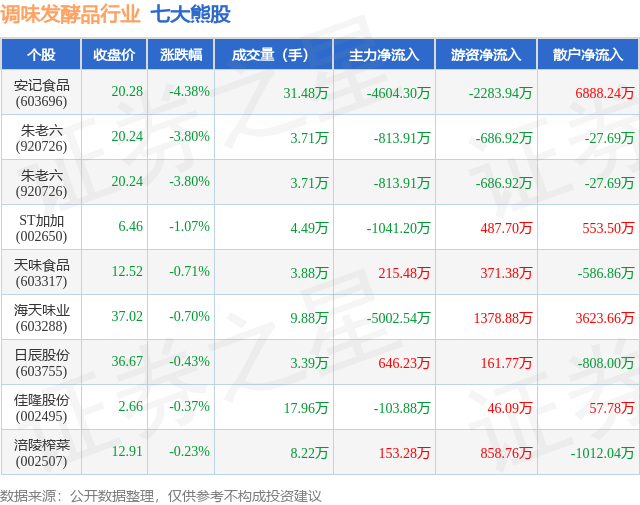 个股表现方面,调味发酵品行业当日领跌股为安记食品(603696),该股当日报收20.28,下跌4.38%,成交量31.48万,主力资金净流出4604.3万元。朱老六(920726)以下跌3.8%紧随其后,该股当日成交量3.71万,主力资金净流出813.91万元。除此之外,朱老六(920726)、ST加加(002650)、天味食品(603317)均进入当日熊股之列。具体个股列表见下表: