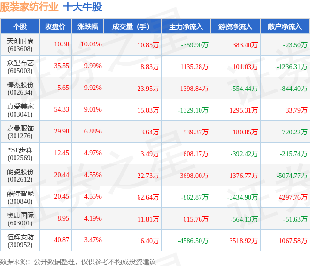 个股表现方面,服装家纺行业当日领涨股为天创时尚(603608),该股当日报收10.3,上涨10.04%,成交量10.85万,主力资金净流出359.9万元。众望布艺(605003)以上涨9.99%紧随其后,该股当日成交量8.83万,主力资金净流入1135.28万元。除此之外,棒杰股份(002634)、真爱美家(003041)、嘉曼服饰(301276)均进入当日牛股之列。具体个股列表见下表: