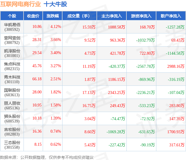 个股表现方面,互联网电商行业当日领涨股为华凯易佰(300592),该股当日报收10.86,上涨4.12%,成交量15.59万,主力资金净流入1088.58万元。壹网壹创(300792)以上涨3.66%紧随其后,该股当日成交量9.52万,主力资金净流入963.36万元。除此之外,凯淳股份(301001)、焦点科技(002315)、青木科技(301110)均进入当日牛股之列。具体个股列表见下表: