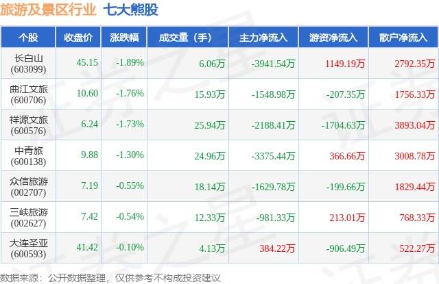 个股表现方面,旅游及景区行业当日领跌股为长白山(603099),该股当日报收45.15,下跌1.89%,成交量6.06万,主力资金净流出3941.54万元。曲江文旅(600706)以下跌1.76%紧随其后,该股当日成交量15.93万,主力资金净流出1548.98万元。除此之外,祥源文旅(600576)、中青旅(600138)、众信旅游(002707)均进入当日熊股之列。具体个股列表见下表: