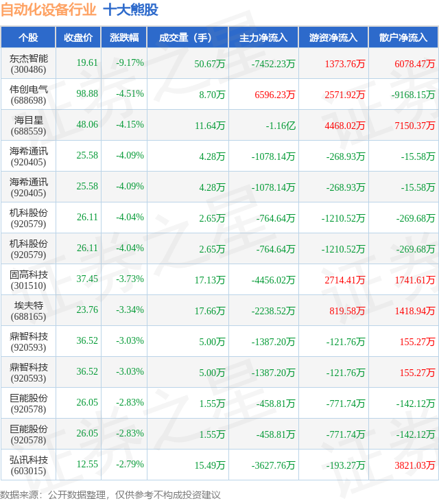 个股表现方面,自动化设备行业当日领跌股为东杰智能(300486),该股当日报收19.61,下跌9.17%,成交量50.67万,主力资金净流出7452.23万元。伟创电气(688698)以下跌4.51%紧随其后,该股当日成交量8.7万,主力资金净流入6596.23万元。除此之外,海目星(688559)、海希通讯(920405)、海希通讯(920405)均进入当日熊股之列。具体个股列表见下表: