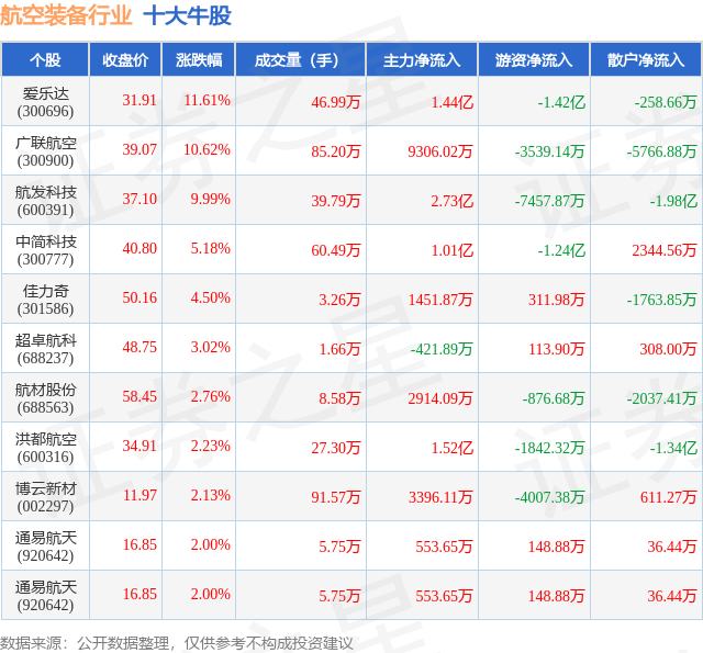 个股表现方面,航空装备行业当日领涨股为爱乐达(300696),该股当日报收31.91,上涨11.61%,成交量46.99万,主力资金净流入1.44亿元。广联航空(300900)以上涨10.62%紧随其后,该股当日成交量85.2万,主力资金净流入9306.02万元。除此之外,航发科技(600391)、中简科技(300777)、佳力奇(301586)均进入当日牛股之列。具体个股列表见下表:
