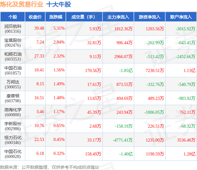 个股表现方面,炼化及贸易行业当日领涨股为润贝航科(001316),该股当日报收39.48,上涨5.31%,成交量5.93万,主力资金净流入1812.36万元。宝莫股份(002476)以上涨2.84%紧随其后,该股当日成交量32.81万,主力资金净流入906.44万元。除此之外,和顺石油(603353)、中国石油(601857)、万邦达(300055)均进入当日牛股之列。具体个股列表见下表:
