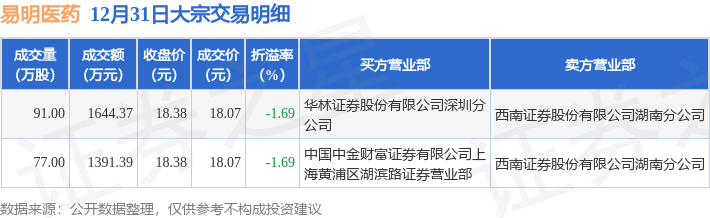 证券之星消息,12月31日易明医药发生大宗交易,交易数据如下: