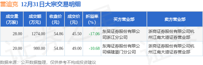 证券之星消息,12月31日雷迪克发生大宗交易,交易数据如下: