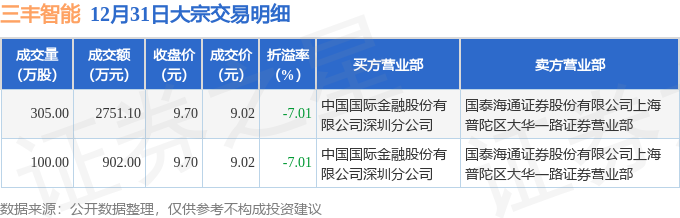 证券之星消息,12月31日三丰智能发生大宗交易,交易数据如下: