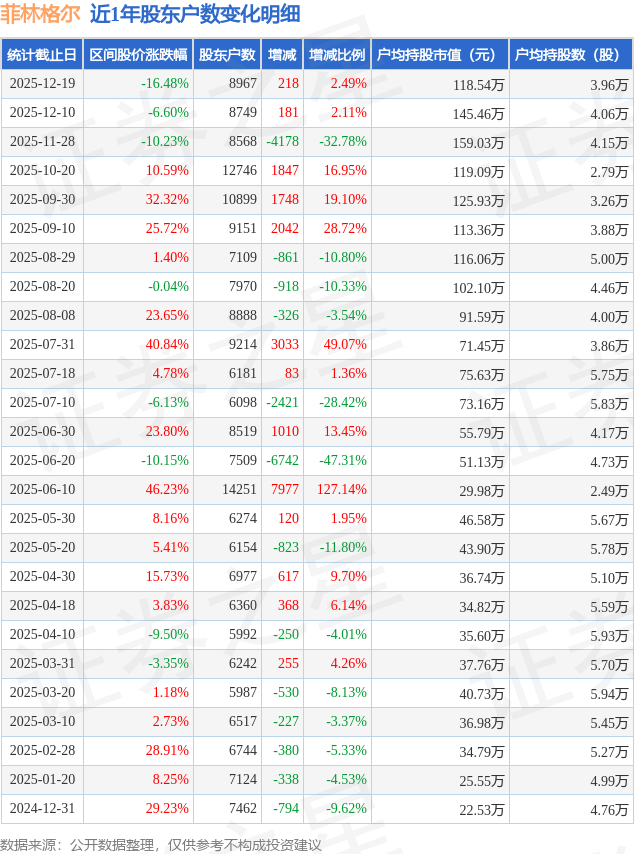 从股价来看,2025年12月10日至2025年12月19日,菲林格尔区间跌幅为16.48%,在此期间股东户数增加218.0户,增幅为2.49%。