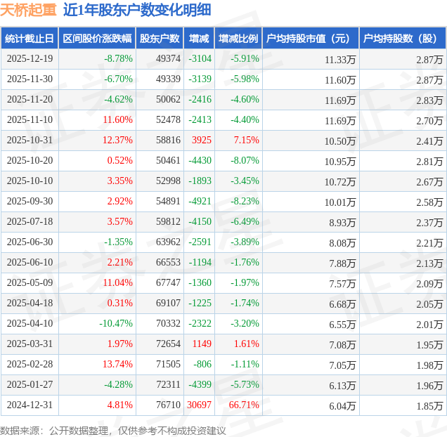 从股价来看,2025年11月10日至2025年12月19日,天桥起重区间跌幅为8.78%,在此期间股东户数减少3104.0户,减幅为5.91%。